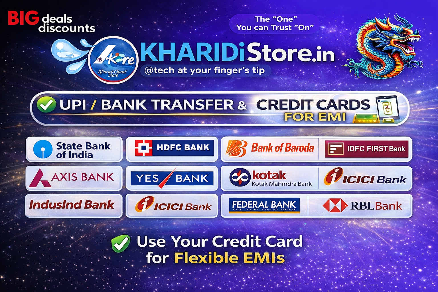 KHARIDi Store accepts UPI and Bank Transfers, along with Debit Card and Credit Card / Credit Card EMI options from State Bank of India, HDFC Bank, Bank of Baroda, IDFC Bank, Axis Bank, Yes Bank, Kotak Mahindra Bank, IndusInd Bank, ICICI Bank, Citibank, Federal Bank, HSBC Bank, and RBL Bank.